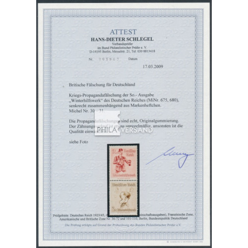 Britische Propagandafälschung für Deutschland 1944 - sogenannte Winterhilfswerk-Ausgabe im senkrechten Zusammendruck aus Markenheftchen (wie üblich mit leicht unregelmässiger Zähnung), einwandfrei postfrisch und mit Attest Schlegel, BPP