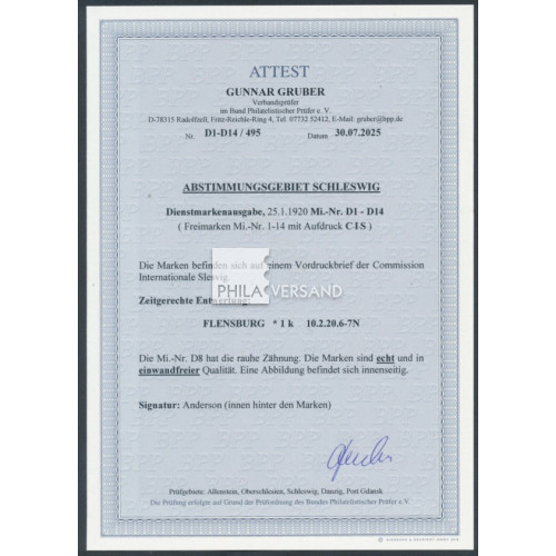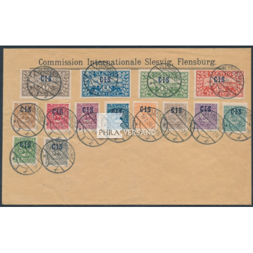 Dienstmarken 1920 - höchst seltenes Angebot im kompletten Satz auf Blankoumschlag der Commission Internationale Slesvig, Flensburg, jede Marke einzeln und extrem sauber entwertet und mit Attest Gruber, BPP