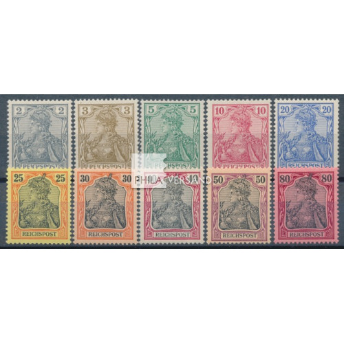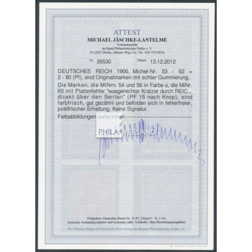 Reichspost 1900 - Germania Reichspost im kompletten Satz einwandfrei postfrisch und völlig ohne Signaturen, Michel# 60 zudem mit seltenem Plattenfehler " waagerechter Kratzer unten durch REIC in REICHSPOST " (mittlerweile auch im Michel Spezial unter der Nummer 60 VI gelistet), ein in dieser Form seltenes Angebot mit Attest Jäschke-Lantelme, BPP für den kompletten Satz mit Plattenfehler