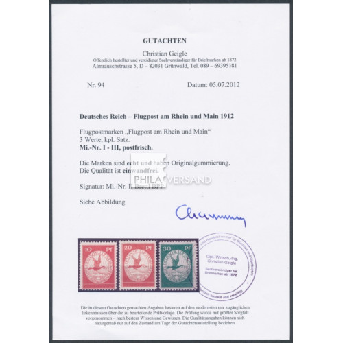 Flugpost an Rhein + Main 1912 - einwandfrei postfrisch und mit Gutachten Geigle
