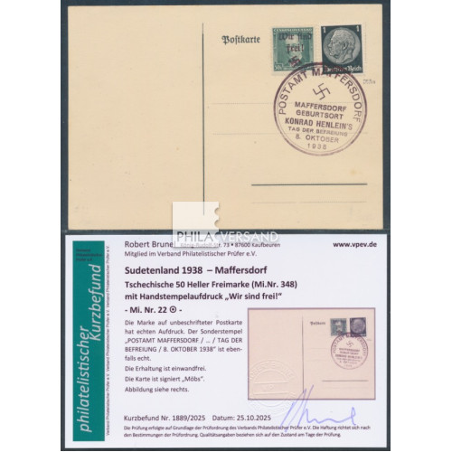 Maffersdorf 1938 - 50 Heller Benes mit Aufdruck aus Maffersdorf in einwandfreier Erhaltung nebst Zusatzfrankatur auf Blankopostkarte und mit Befund Brunel, VPEV
