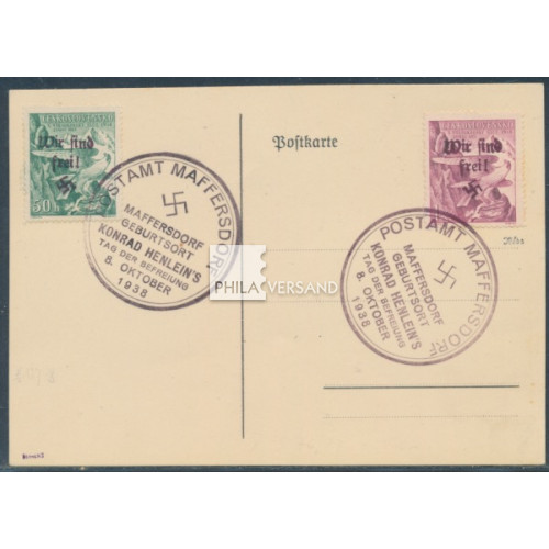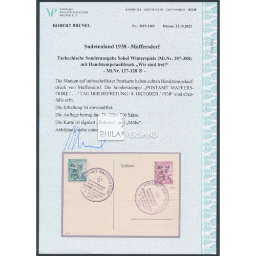 Maffersdorf 1938 - Sokol Winterspiele mit Aufdruck aus Maffersdorf als Satzfrankatur auf Blankopostkarte mit Sonderstempeln in einwandfreier Erhaltung und mit Attest Brunel, VPEV