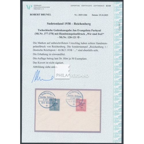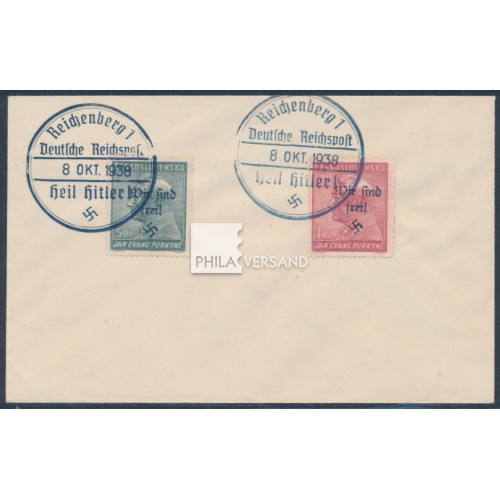 Reichenberg 1938 - 50 Heller und 1 Krone Purkyne als höchst seltener Satz und perfekt entwertet auf Blankobrief, einwandfreie Erhaltung und mit Expertise Brunel, VPEV