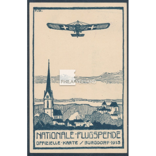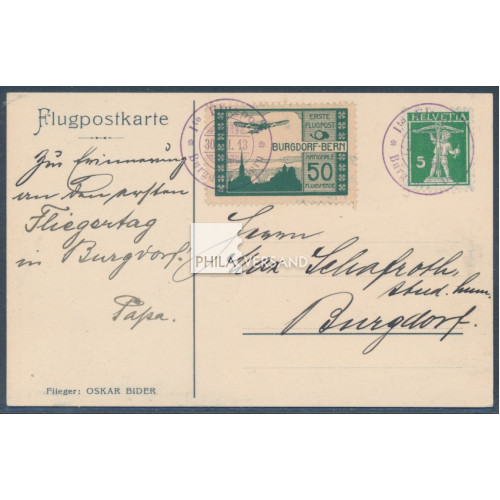 Flugpost Burgdorf 1913 - immer gesuchte Flugmarke des Flugtages Burgdorf 1913 auf offizieller Karte mit tollem Motiv " Monoplan über Burgdorf " mit 5 Rappen Tellknabe und mit perfekt abgeschlagenen Sonderstempeln " 1te Flugpost Burgdorf-Bern 30.III.13 " entwertet, ausgezeichnete Erhaltung