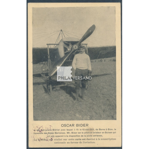 Flugpost Biel 1913 - Flugtag Biel 1913 auf offizieller Karte mit tollem Motiv " Oskar Bider " in französischem Text mit Tellknabe Frankatur und mit perfekt abgeschlagenen Sonderstempeln in rotlila " Schweizerische Flugpost 8.VI.13 " entwertet und mit nebengesetztem Kastenstempel " Erste Flug Post Biel-Bern....." in ausgezeichneter Erhaltung, Schweizer Luftpost-Handbuch PF 10 A 1 x