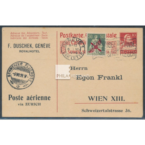 Flugpost Genf nach Lausanne 1919 - mit Kartenschluss beförderter Beleg ab Genf 6.VI.19 via Lausanne nach Zürich, von dort dann per Bahn nach Wien, ausgezeichnete Erhaltung, Schweizer Luftpost-Handbuch RF 19.1 gg SpF