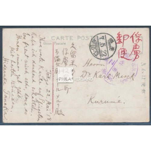 Kriegsgefangenenpost Lager Kurume 1918 - wunderbare Ansichtskarte mit Poststempel vom 22.5.1918 sowie offenbar handschriftlichem Postleitvermerk in roter Tinte, geschrieben in Tokio und gesendet Dr. Karl Merck im Gefangenenlager Kurume mit großem Siegelstempel in violetter Farbe, ein hochinteressantes Stück in sehr guter Bedarfserhaltung