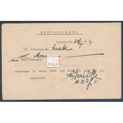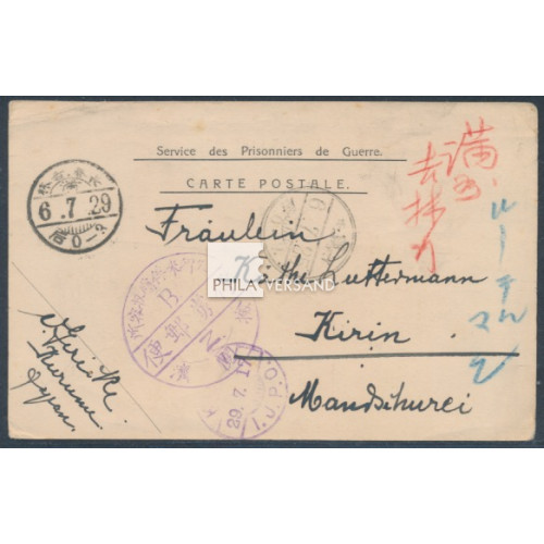 Kriegsgefangenenpost Lager Kurume 1917 - vorgedruckte Bestätigungskarte aus dem Lager Kurume über den Erhalt von Geld/Paket, gesendet von einem Gefangenen aus dem Lager Kurume an Fräulein Käthe Luttermann nach Kirin in der Mandschurei. Karte mit entsprechenden Aufgabe- und Transitstempeln, mit großem Siegel in violett mit Buchstabe B sowie mit diversen handschriftlichen Leitvermerken, sehr gute Bedarfserhaltung mit üblichen Beförderungsspuren