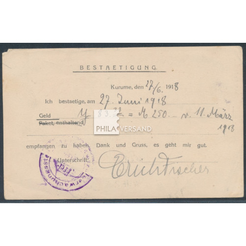 Kriegsgefangenenpost Lager Kurume 1918 - vorgedruckte Bestätigungskarte aus dem Lager Kurume über den Erhalt von Geld, gesendet von einem Gefangenen aus dem Lager Kurume nach Schweinfurt. Karte mit entsprechenden Aufgabestempel aus Kurume 28.6.1918, rotem Leitstempel (Deutschland) sowie mit großem Siegel in violett mit Buchstabe C. In Deutschland mit immer gesuchter Eingangszensur der Überwachungsstelle Cöln-Deutz (vorder- und rückseitig) versehen. Ein seltenes Stück in guter Gesamterhaltung mit üblichen Beförderungsspuren (minimaler Eckfehler oben rechts)