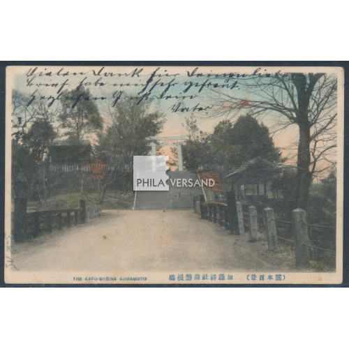 Kriegsgefangenenpost Lager Kumamoto 1915 - wunderbare Ansichtskarte " The Kato-Shrine Kumamoto " mit Poststempel vom 22.3.1915 sowie HAN von Watanabe, rotem SDPDG-Stempel und perfekt abgeschlagenem großen Lager-Siegel gesendet an das Hotel zur Börse in Tsingtau, hochinteressante Post nach Kiautschou in ausgezeichneter Erhaltung