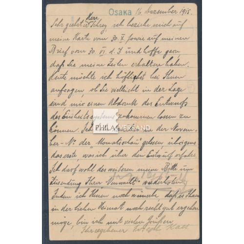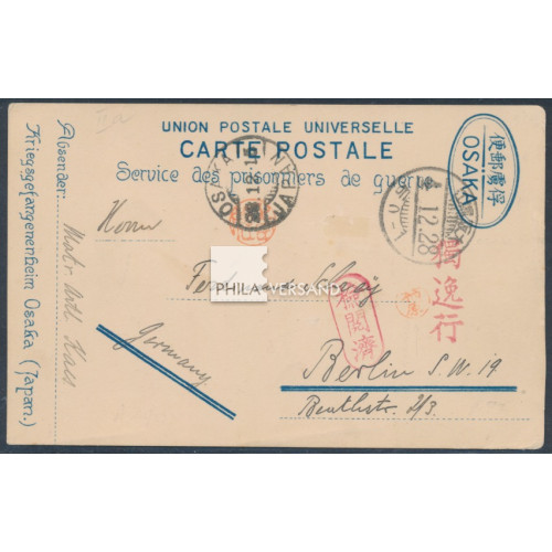 Kriegsgefangenenpost Lager Osaka 1915 - Ganzsachenkarte in Type II, im Absendervordruck links außen mit zusammenhängendem a und n von Japan, sowie mit senkrecht stehendem blauen Siegel mit Zensurstempeln, diversen Namensstempeln (HAN) der Kontrolleure gesendet ab Osaka 28.12.1915 mit zusätzlichem Transitstempel aus Osaka nach Berlin, sehr gute Erhaltung