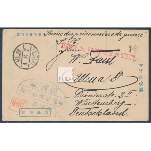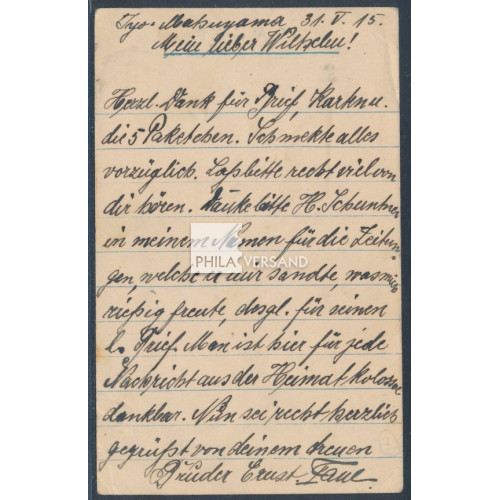Kriegsgefangenenpost Lager Matsuyama 1915 - Ganzsachenkarte in Type I mit Aufgabestempel vom 7.6.4 (1915) und großem Lagerstempel vom Camp Matsuyama in grün (bessere Farbe!) sowie SDPDG Stempel und HAN Namensstempel von Motomiya gesendet mit viel Kartentext nach Ulm, sehr gute Bedarfserhaltung mit üblichen Beförderungsspuren