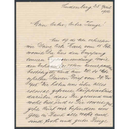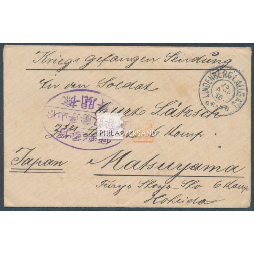 Kriegsgefangenenpost Lager Matsuyama 1916 - Brief mit vollständigem und mehrseitigem Inhalt geendet aus Lindenberg 25.Apr. 16 in das Kriegsgefangenenlager Matsuyama mit großem Lagersiegel in violett und HAN Namensstempel von Motomiya. Der Brief trägt rückseitig eine immer gesuchte brefmarkenähnliche Siegelmarke aus dem Kriegsgefangenenlager Matsuyama, welche nach der Zensur im Lager bei eingehenden Briefen verwendet wurde, ein ausserordentlich interessantes Stück in guter Bedarfserhaltung
