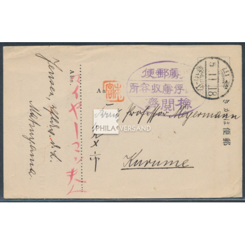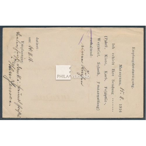 Kriegsgefangenenpost Lager Matsuyama 1916 - Ganzsachenkarte als vorgedruckte Empfangsbestätigung mit handschriftlichem Leitvermerk Kurume, Poststempel aus Matsuyama 18.11.5 (1916) und großem Lagersiegel vom Camp Matsuyama in violett sowie HAN Namensstempel von Motomiya gesendet an eine in Freiheit lebende Tsingtauerin in Kurume, ein interessantes Stück in guter Bedarfserhaltung
