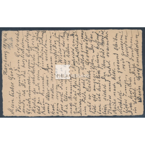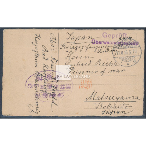 Kriegsgefangenenpost Lager Matsuyama 1916 - Postkarte mit handschriftlichem Hinweis " tax free " und deutschem Zensurstempel gesendet ab Bad Harzburg 17.8.16 in das Kriegsgefangenenlager Matsuyama mit großem Lagersiegel in violett und HAN Namensstempel von Motomiya, ausserordentlich viel Kartentext und in ausgezeichneter Bedarfserhaltung