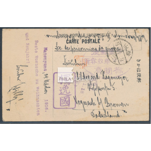 Kriegsgefangenenpost Lager Matsuyama 1916 - Ansichtskarte mit wunderbarem Bildmotiv und Kartenstempel " Matsuyama 1916 Beste Wünsche zu Weihnachten und Neujahr! " gesendet aus dem Kriegsgefangenenlager Matsuyama mit großem Lagersiegel in violett, Postleitstempel Doitsu-Koku im Rechteck (Deutschland), Transitstempel Kobe 13.11.16, Poststempel Matsuyama 9.11.5 (1916) und HAN Namensstempel von Motomiya gesendet nach Vegesack bei Bremen, sehr gute Erhaltung
