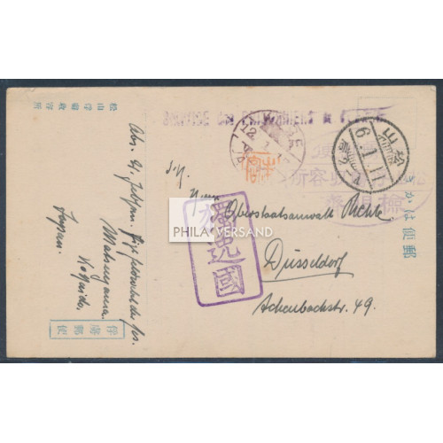 Kriegsgefangenenpost Lager Matsuyama 1917 - Postkarte gesendet aus dem Kriegsgefangenenlager Matsuyama mit großem Lagersiegel in violett, Postleitstempel Doitsu-Koku im Rechteck (Deutschland), SDPDG Stempel in violett, Poststempel Matsuyama 11.1.6 (1917) und HAN Namensstempel von Motomiya mit Transitstempel aus Kobe 12.1.1917 gesendet nach Düsseldorf, ausgezeichnete Erhaltung