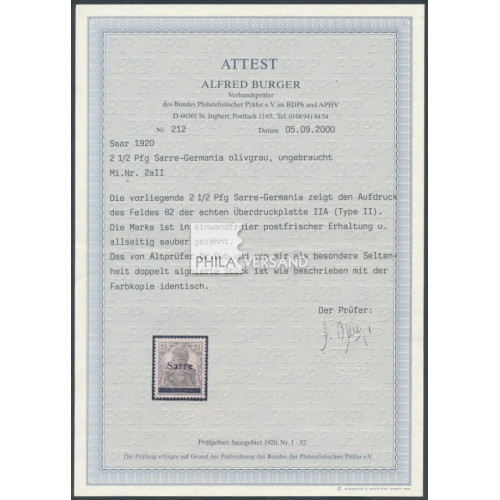 Germania 1920 - 2 1/2 Pfennig einwandfrei postfrisch in guter Farbe und seltener Aufdrucktype II und mit Attest Burger, BPP