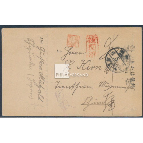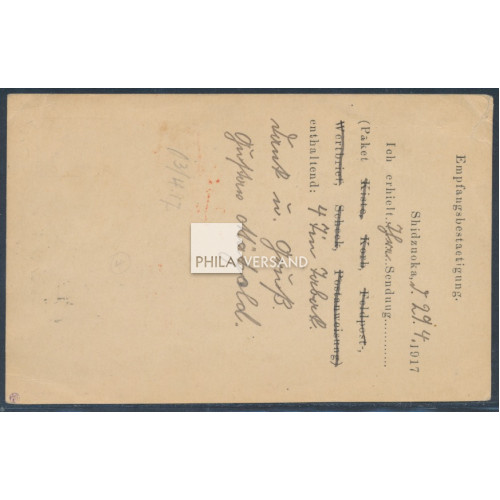 Kriegsgefangenenpost Lager Shizuoka 1917 - Ganzsachenkarte des Lagers als Empfangsbestätigung (Seitz Typ III a) über den Erhalt eines Paketes gesendet vom Gefangenen Gustav Mätzold mit Postaufgabestempel von Shizuoka 2.5.6 (1917) und mit Furyoyubin Einzelstempel in schwarz, kenetsuzumi Einzelstempel in orangebraun sowie HAN Namensstempel des Kontrolleurs Takahashi und handschriftlichem Leitvermerk für Tientsin gesnedet nach Tientsin, Karte vorderseitig oben links mit kleinem Transportspalt, ansonsten in sehr guter Bedarfserhaltung