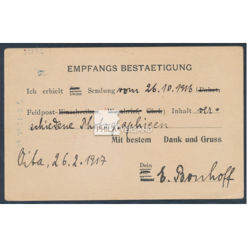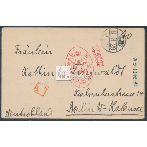 Kriegsgefangenenpost Lager Oita 1917 - Ganzsachenkarte des Lagers als Empfangsbestätigung gesendet vom Gefangenen Ernst Bonhoff mit Postaufgabestempel von Oita 28.2.6 (1917) und mit perfekt abgeschlagenem Lagerstempel, HAN Namensstempel des Kontrolleurs Utsumi und Leitstempel für Deutschland gesendet nach Berlin-Halensee, ausgezeichnete Bedarfserhaltung