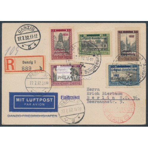 LUPOSTA 1932 - kompletter Satz zur Ausstelllung entwertet mit Ausstellungs-Sonderstempeln vom 27.7.32 auf Zeppelin-Sonderkarte mit tollem Bildmotiv gesendet als Einschreiben mit normaler Luftpost (kein Zeppelinflug, von dieser Ausstellung seltener) gesendet nach Berlin (diverse Ankunftstempel, offenbar per Rohrpost innerhalb von Berlin befördert), Karte mit minimalen Stauchungen (bei Rohrpost durchaus normal), ansonsten in sehr guter Bedarferhaltung