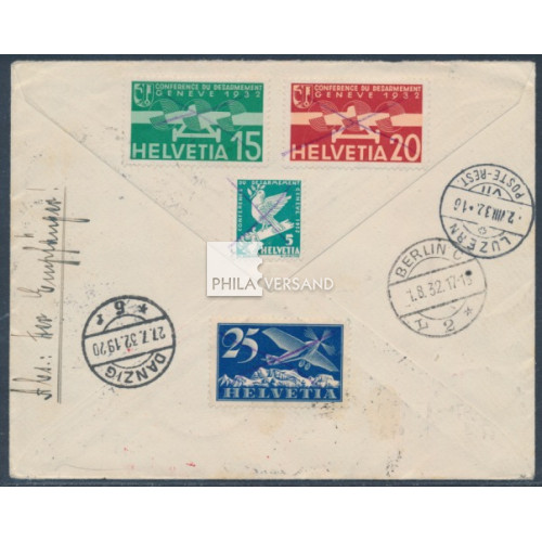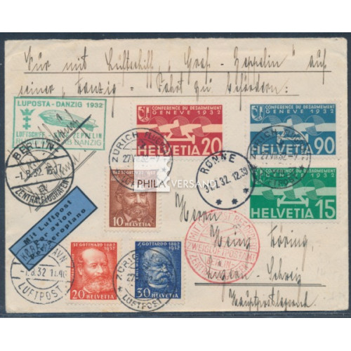Fahrt nach Danzig 1932 - gute Zuleitung aus der Schweiz als dekorativ frankiertes Briefkuvert gesendet ab Zürich 27.VII.32 per Luftpost nach Danzig. Von dort auf der Rundfahrt mit Luftschiff befördert mit Postabwurf Rönne (Ankunftstempel) und mit Luftpost über Kopenhagen und Berlin nach Luzern, rückseitig vier weitere Marken mit Federzugentwertung sowie 3 weitere Transit/Ankunftstempel, ausgezeichnete Erhaltung und sehr dekorativ, Michel Zeppelin Spezialkatalog 261 I A (CH), Sieger 170 Aa (CH)