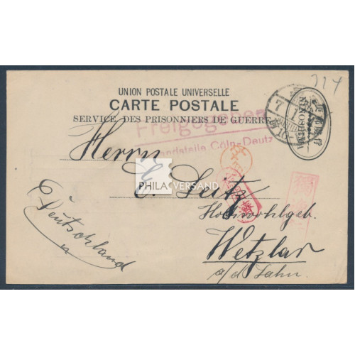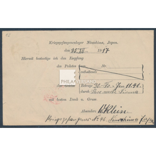 Kriegsgefangenenpost Lager Ninoshima 1918 - Ganzsachenkarte (Seitz Type I) mit rückseitig gedruckter Empfangsbestätigung gesendet vom deutschen Kriegsgefangenen Klein aus dem Lager Ninoshima mit Poststempel aus Ujina 4.1.7 (1918) und Einzelstempel Kenetsuzumi, HAN-Namensstempel des Kontrolleurs Niwa, rotem Postleitstempel für Deutschland und besserer deutscher Eingangszensur aus Cöln-Deutz gesendet nach Wetzlar, sehr gute Bedarfserhaltung