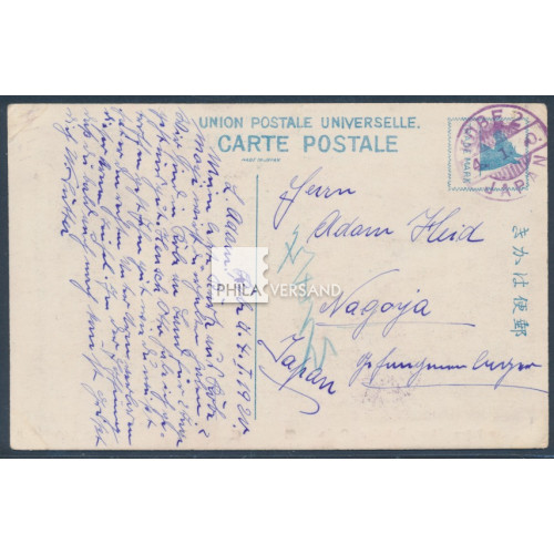 Heimkehrerpost 1920 - 3.Heimtransport mit Dampfer Himalaya Maru von Moji über Kobe am 5.1.1920 auf japanischer Ansichtskarte von Osaka 2 mit violettem Poststempel 4.1.1920 gesendet an den deutschen Kriegsgefangenen Adam Heid im Kriegsgefangenenlager Nagoya. Es handelt sich um einen späten Beleg (bereits ohne Zensur) - Absender ist Walter Sutter zuletzt deutscher Kriegsgefangener im Lager Nagoya, sehr gute Bedarfserhaltung