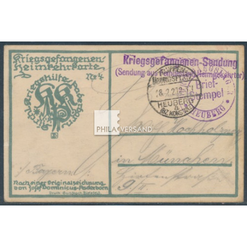 Heimkehrerpost 1920 - an die mit der Hudson Maru in Bremerhaven angekommenen Heimkehrer gab die kirchliche Kriegshilfe Paderborn Postkarten mit verschieden Motiven aus. Es handelt sich hierbei um eine Karte mit dem nummerierten Motiv 4 (von insgesamt 6 verschiedenen Motiven, laut Seitz Handbuch). Das seltene Angebot trägt den Poststempel des Truppenübungsplatz Heuberg vom 28.2.20, den violetten Briefstempel " Durchgangslager Heuberg " und den gesuchten Stempel " Kriegsgefangenen-Sendung (Sendung aus Feindesland Heimgekehrter) ein hochinteressantes Angebot in sehr guter Bedarfserhaltung