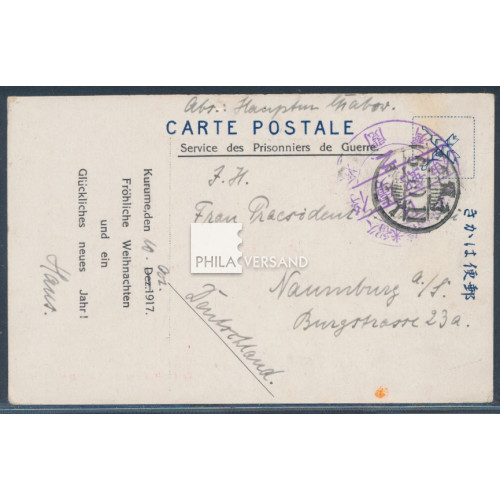 Kriegsgefangenenpost Lager Kurume 1916 - Grußzudruck " Fröhliche Weihnachten...." (Seitz Typ b) auf Ansichtskarte mit tollem Motiv gesendet vom deutschen Kriegsgefangenen Hauptmann Hans Grabow aus dem Lager Kurume mit Poststempel aus Kurume 11.10.6 (1917) und großem Lagerstempel mit Kennbuchstabe B gesendet nach Naumburg, sehr gute Bedarfserhaltung