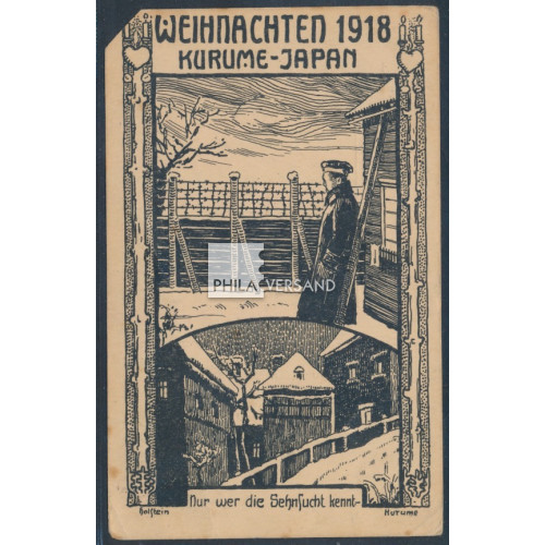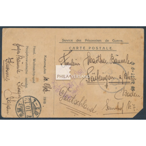 Kriegsgefangenenpost Lager Kurume 1918 - seltene Lager-Bildpostkarte " Weihnachten 1918 " (Seitz Typ e) gesendet vom deutschen Kriegsgefangenen Eugen Bäumle aus dem Lager Kurume mit Poststempel aus Kurume 12.10.7 (1918) und großem Lagerstempel mit Kennbuchstabe C und britischem Zensurstempel "P.C." gesendet nach Säckingen. Karte mit kleinem Eckfehler und üblichen Alter- bzw. Transportspuren, ansonsten in guter Gesamterhaltung - ein seltenes Angebot