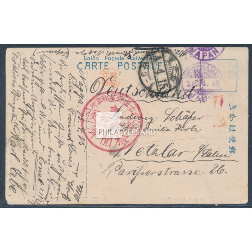 Kriegsgefangenenpost Lager Nagoya 1915 - wunderbare Ansichtskarte " Ginkakuji Kyoto " gesendet vom deutschen Kriegsgefangenen Karl Erbe mit Poststempel aus Nagoya vom 15.4.4 (1915) sowie HAN von Hayashida/Teraro, Auslandspoststempel aus Yokohama 16.4.15, perfekt abgeschlagenem großen Lager-Siegel des Lagers Nagoya und rotem Leitstempel für Deutschland mit viel Kartentext nach Wetzlar, sehr gute Bedarfserjaltung