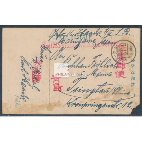 Kriegsgefangenenpost Lager Marugame 1916 - seltene Lager-Bildpostkarte (es gab lediglich zwei Motive) " Fröhliche Weihnachten " gesendet vom deutschen Kriegsgefangenen Karl Haack aus dem Lager Marugame mit Poststempel aus Marugame 18.12.5 (1916) und Kenetsuzumi und Furyoyubin Einzelstempeln, SdPdG-Stempel in Type I und Postleitstempel für Tsingtau gesendet nach Tsingtau. Karte mit kleinem Eckfehler und üblichen Alter- bzw. Transportspuren, ansonsten in guter Gesamterhaltung - ein seltenes Angebot