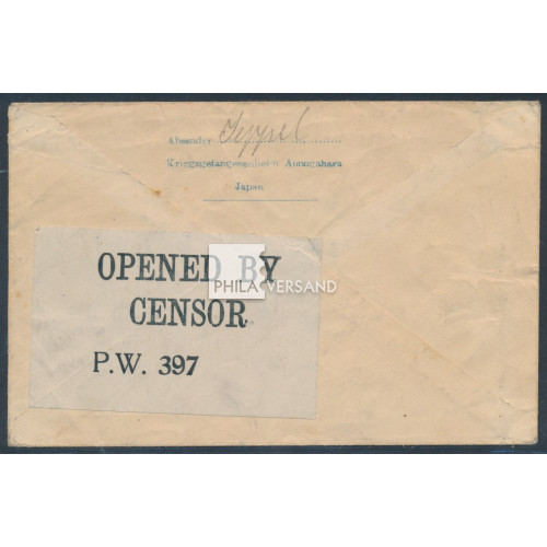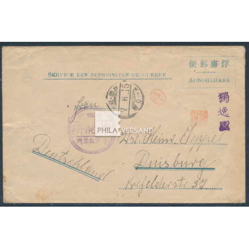 Kriegsgefangenenpost Lager Aonogahara 1918 - Lagerganzsachenumschlag in Type II gesendet vom deutschen Kriegsgefangenen Heinrich Jeppel aus dem Lager Aonagahara mit Postaufgabestempel von Hyogo/Takino 15.6.7 (1918) mit kleinem Lagerstempel, HAN-Namensstempel des Kontrolleurs Shoji und ebenso des Kontrolleurs Sakaguchi, Postleitstempel für Deutschland und rückseitigem britischen Zensuraufkleber gesendet nach Duisburg, ein interessanter Beleg in sehr guter Bedarfserhaltung