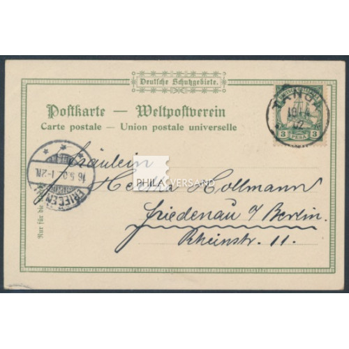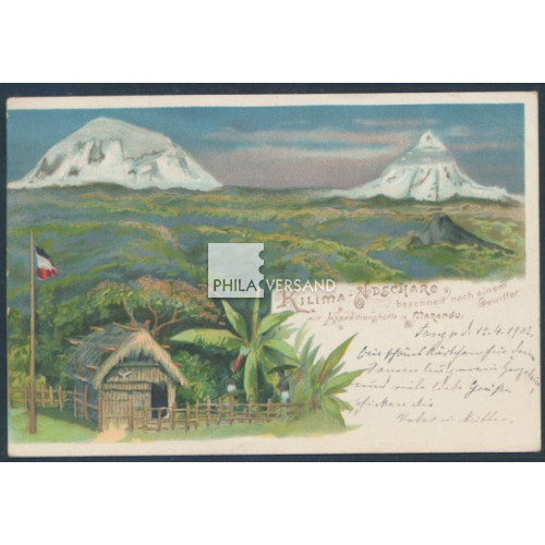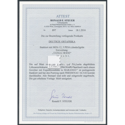 Yacht 1902 - 3 Pesa als Einzelfrankatur und perfekt zentrisch entwertet " Tanga 18/4 02 " auf wunderbarer Litho-Ansichtskarte mit tollem Motiv " Kilima-Ndscharo beschneit nach einem Gewitter mit Expeditionshütte in Marangu " gesendet mit Kartentext nach Friedenau (Ankunftstempel), sehr gute Bedarfserhaltung und mit Attest Steuer, BPP