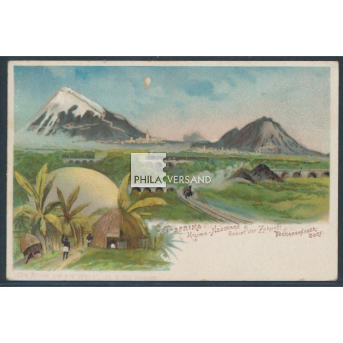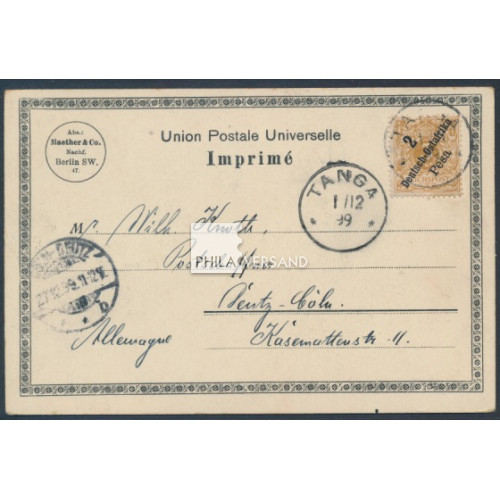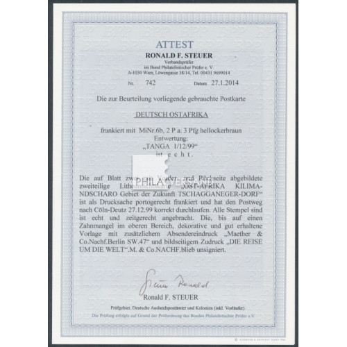 Krone 1899 - 2 Pesa auf 3 Pfennig in besserer Farbe als Einzelfrankatur und gut lesbar entwertet " Tanga 1/12 99 " auf wunderbarer Litho-Ansichtskarte mit tollem Motiv " Kilima-Ndscharo Gebiet der Zukunft Tschagganeger-Dorf " gesendet nach Köln-Deutz Ankunftstempel), Karte in sehr guter Bedarfserhaltung, Marke oben mit Zahnfehler, Attest Steuer, BPP