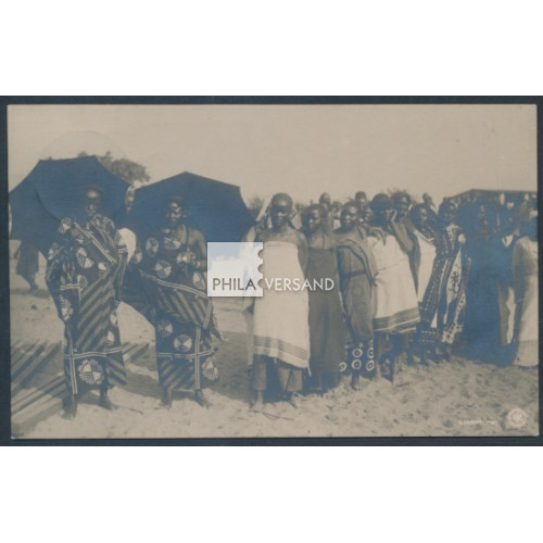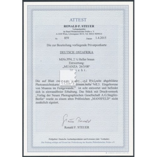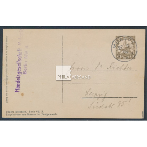 Yacht 1908 - 2 1/2 Heller Wertstempel ausgezeichnet und nahezu zentrisch entwertet " Muanza 27 3 08 " auf Privatpostkarte mit tollem Motiv " Unsere Kolonien. Serie VII 5. Eingeborene von Muanza im Festgewande " gesendet nach Leipzig. Das sehr seltene Exemplar befindet sich in ausgezeichneter Erhaltung nahezu völlig ohne die sonst üblichen Beförderungsspuren, trägt eine Signatur von Mansfeld und Attest Steuer, BPP