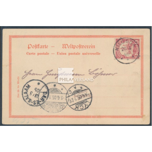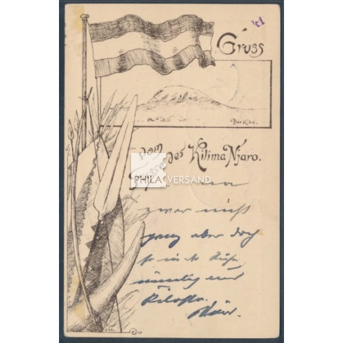 Yacht 1905 - 5 Pesa als Einzelfrankatur und nahezu perfekt zentrisch entwertet " Kilossa 20/4 05 " auf wunderbarer Ansichtskarte mit tollem Motiv " Gruss vom Fusse des Kilima-Njaro. Der Kibo " gesendet mit Kartentext via Dar-Es-Salam nach Lyck, von dort weitergeleitet nach Schreiberhau (jeweils entsprechnde Transit- bzw. Ankunftstempel), sehr gute Bedarfserhaltung (bildseitig kleine Falzreste)