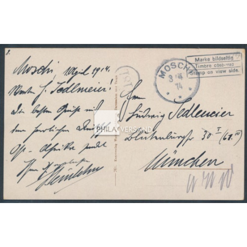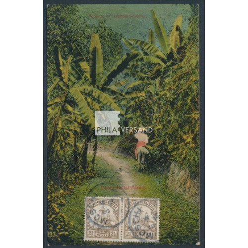 Yacht 1914 - " 1/2 Heller im waagerechten Paar mit Wasserzeichen als Mehrfachfrankatur bildseitig auf Ansichtskarte, gut lesbar entwertet " Moschi 3/4 14 " auf wunderbarer Ansichtskarte mit tollem Motiv " Bergweg im Usambara-Gebirge. Deutsch Ost-Afrika " gesendet mit Kartentext nach München (Briefträger-Stempel als Ankunftstempel), sehr gute Bedarfserhaltung