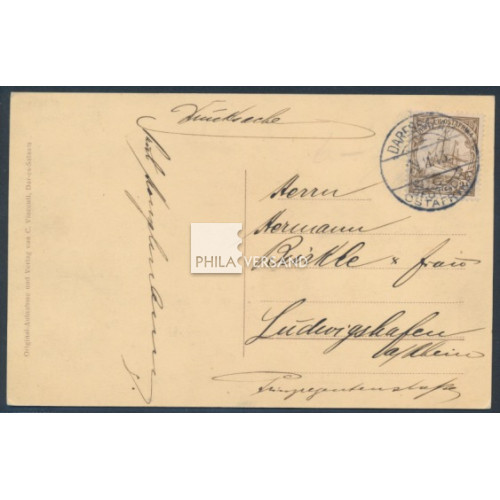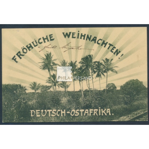 Yacht 1913 - 2 1/2 Heller mit Wasserzeichen als Einzelfrankatur auf Ansichtskarte, sehr gut lesbar entwertet " Daressalam 29.11.13 " auf wunderbarer Ansichtskarte mit tollem Motiv " Fröhliche Weihnachten Deutsch-Ostafrika " gesendet mit Grußtext nach Ludwigshafen, ausgezeichnete Erhaltung und nahezu völlig ohne die sonst üblichen Beförderungsspuren
