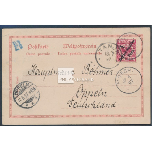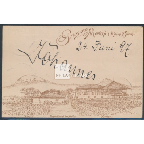 Adler 1897 - 5 Pesa auf 10 Pfennig als Einzelfrankatur auf Ansichtskarte, gut lesbar entwertet " Moschi 25 6 97 " (mit kopfstehendem Tagesdatum!!) auf wunderbarer Ansichtskarte mit seltenem Motiv " Gruss aus Moschi (Kilima Njaro) Kibo. Hauptfront der Station. Mawensi " gesendet via Tanga nach Oppeln (Transit- bzw. Ankunftstempel). Bildseitig minimale Erstfalzreste (kaum erkennbar) und minimaler Eckbug, ansonsten in ausgezeichneter Bedarfserhaltung