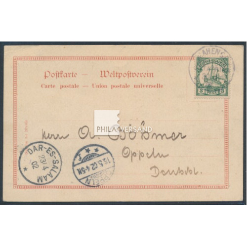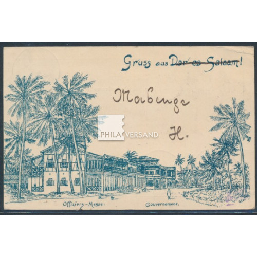 Yacht 1902 - 3 Pesa als Einzelfrankatur auf Ansichtskarte, gut lesbar entwertet mit besserem Stempel " Mahenge 30 3 02 " auf wunderbarer Ansichtskarte mit tollem Motiv " Gruss aus Dar-Es-Salaam Offiziers-Messe. Gouvernement " gesendet via Dar-Es-Salam nach Oppeln (Transit- bzw. Ankunftstempel). Karte bildseitig oben rechts mit Eckstauchung, ansonsten in sehr guter Bedarfserhaltung