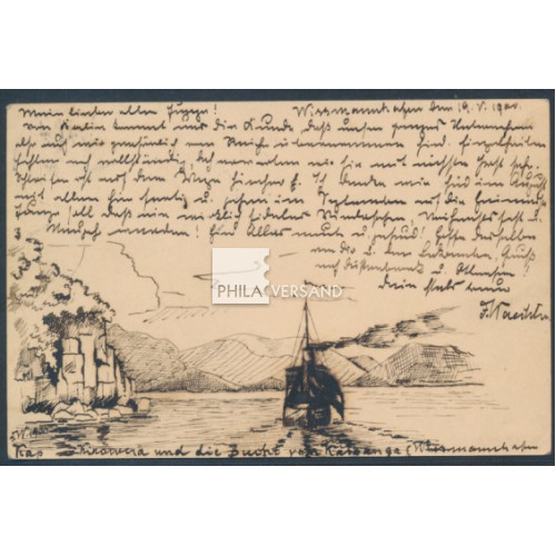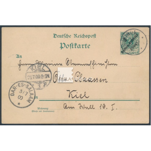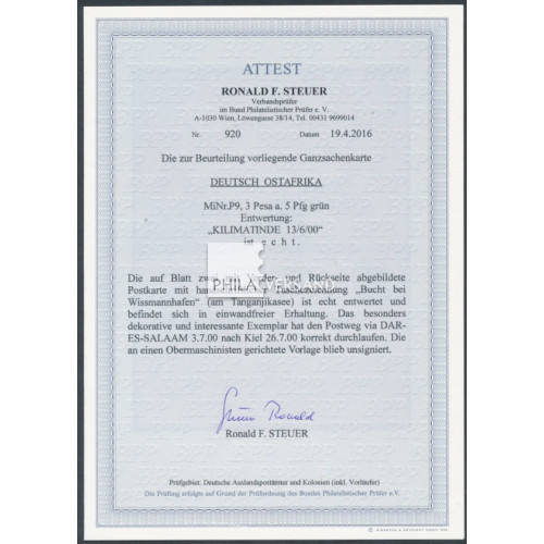 Krone 1900 - 3 Pesa auf 5 Pfennig Krone als Wertstempel auf Postkarte mit handschriftlicher Tuschezeichnung " Bucht bei Wissmannhafen " , gut lesbar entwertet mit besserem Stempel " Kilmatinde 13/6 00 " und gesendet mit sehr viel Kartentext via Dar-Es-Salam nach Kiel (Transit- bzw. Ankunftstempel). Die extrem seltene Karte (u.E. vermutlich ein Unikat) präsentiert sich in ausgezeichneter Bedarfserhaltung mit Attest Steuer, BPP