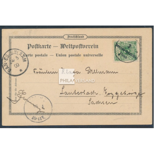 Krone 1900 - 3 Pesa auf 5 Pfennig als Einzelfrankatur auf Ansichtskarte, entwertet am 21/3 00 (Stempelort nicht erkennbar), mit Transitstempel aus " Dar-Es-Salam 24/3 00 " auf Ansichtskarte " Gruss aus Dar-Es-Salam " mit vier tollen Einzelbildern (Kaiser-Strasse; Kasernen Eingang; Wilhelm Ufer; Araberstrasse) gesendet mit Grußtext nach Lauterbach (Ankunftstempel unten links), Karte in ausgezeichneter Erhaltung