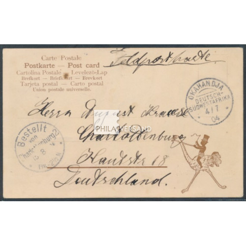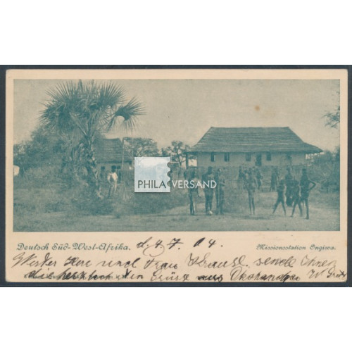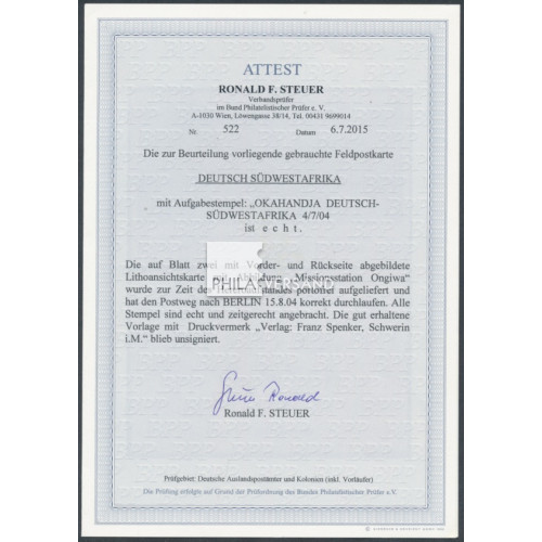 Feldpost 1904 - Ansichtskarte mit seltenem Motiv aus DSW " Missionsstation Ongiwa " gesendet als Feldpostkarte ab " Okahandja 4/7 04 " mit Kartentext nach Berlin (Ankunftstempel), ausgezeichnete Bedarfserhaltung und mit Attest Steuer, BPP