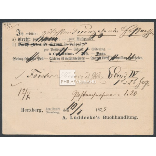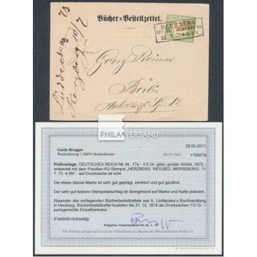 großer Brustschild 1872 - 1/3 Groschen großer Brustschild in sehr guter Erhaltung als Einzelfrankatur auf Bücher-Bestellzettel gesendet ab Herzberg 11 7 73 nach Berlin, sehr gute Bedarfserhaltung und mit Befund Brugger, BPP