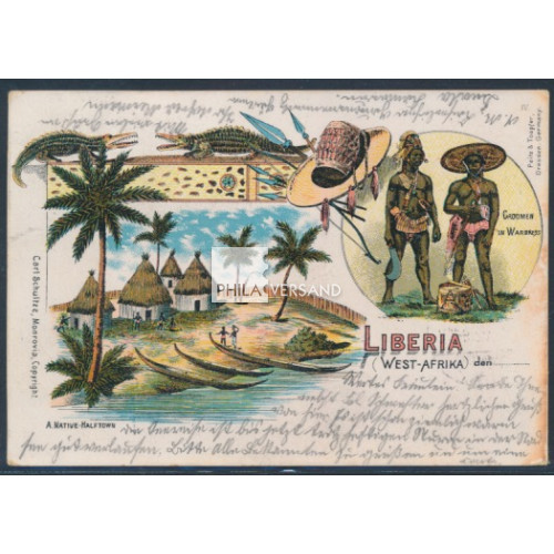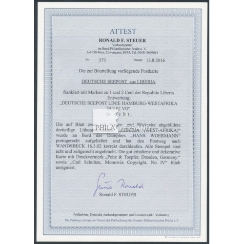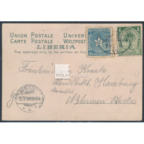 Liberia 1902 - 1 und 2 cents sehr gut lesbar entwertet " Deutsche Seepost Linie Hamburg - Westafrika 24/2 02 VII " auf hochdekorativer Litho-Ansichtskarte " Liberia " mit diversen Einzelbildern gesendet mit Kartentext nach Wandsbek (Ankunftstempel), ausgezeichnete Bedarfserhaltung und mit Attest Steuer, BPP