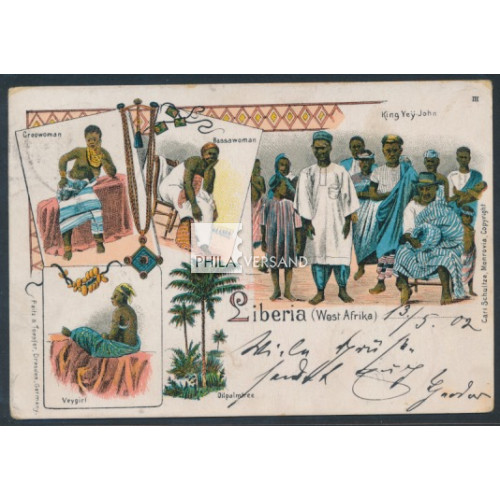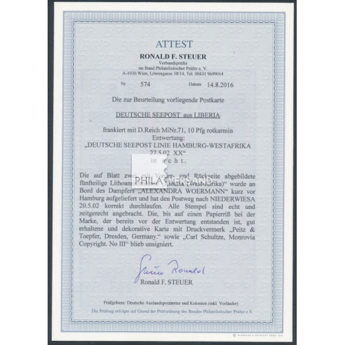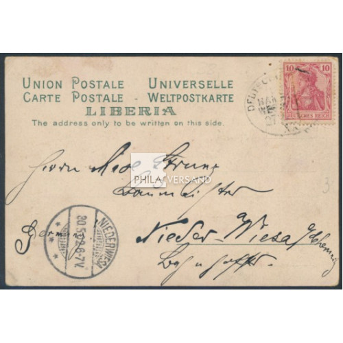 Germania 1902 - 10 Pfennig sehr gut lesbar entwertet " Deutsche Seepost Linie Hamburg - Westafrika 27/2 02 XX " auf hochdekorativer Litho-Ansichtskarte " Liberia " mit diversen Einzelbildern gesendet mit Kartentext nach Niederwiesa (Ankunftstempel), Marke mit Bedarfseinriss, ansonsten sehr gute Bedarfserhaltung und mit Attest Steuer, BPP