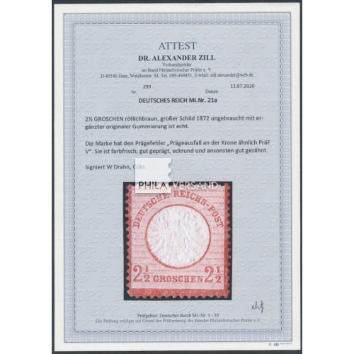 großer Brustschild 1872 - 2 1/2 Groschen ungebraucht mit ergänzer originaler Gummierung und mit seltenem Prägefehler " Prägeausfall an der Krone " (ähnlich PräF V), unten links minimal eckrund, ansonsten in sehr guter Erhaltung und mit Attest Dr. Zill, BPP