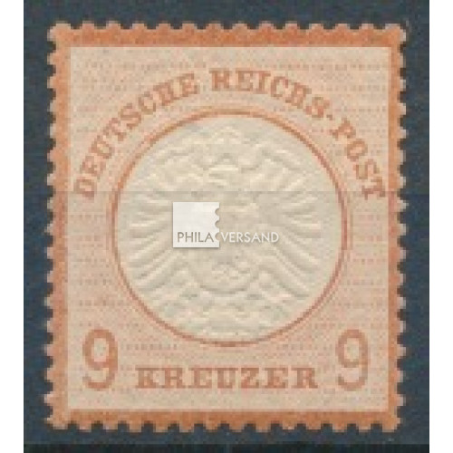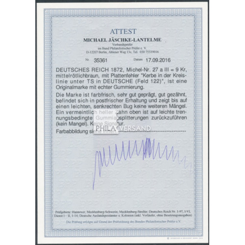 großer Brustschild 1872 - 9 Kreuzer Marke in ausgezeichneter postfrischer Erhaltung und mit seltenem Plattenfehler " Kerbe in der kreislinie unter TS in DEUTSCHE " und mit Attest Jäschke-Lantelme, BPP, den im Attest benannten leichten Bug können wir nicht erkennen, ein extrem seltenes Stück